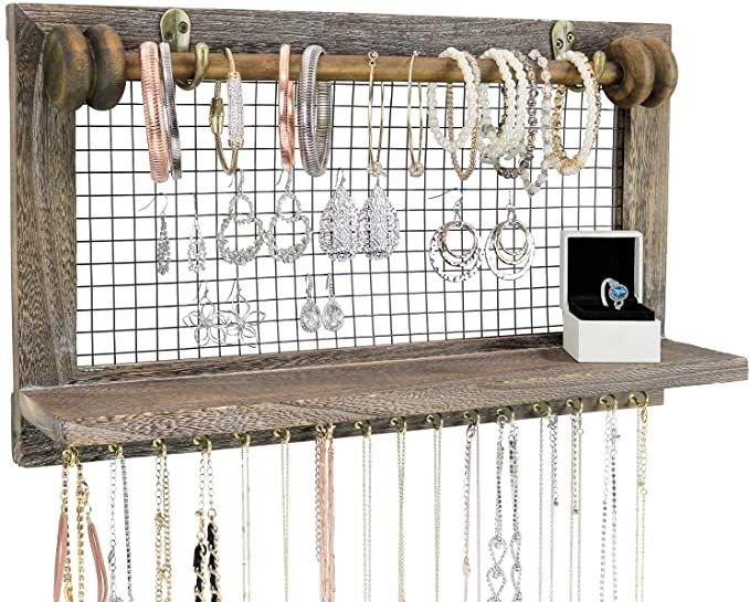 Express your individuality with this attractive wooden jewelry organizer. This rustic wooden jewelry organizer offers creative storage for your jewelry. It features a ledge shelf and a mesh wire back screen. You won’t have to rummage around for doodads any longer.