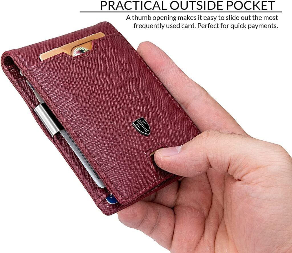 Protect yourself against data theft by RFID scanners with this RFID-blocking slim wallet with a money clip for cards and cash. It has a bifold closure and thumb notch for added convenience. Choose from colors such as red, carbon, cognac, black, and more.