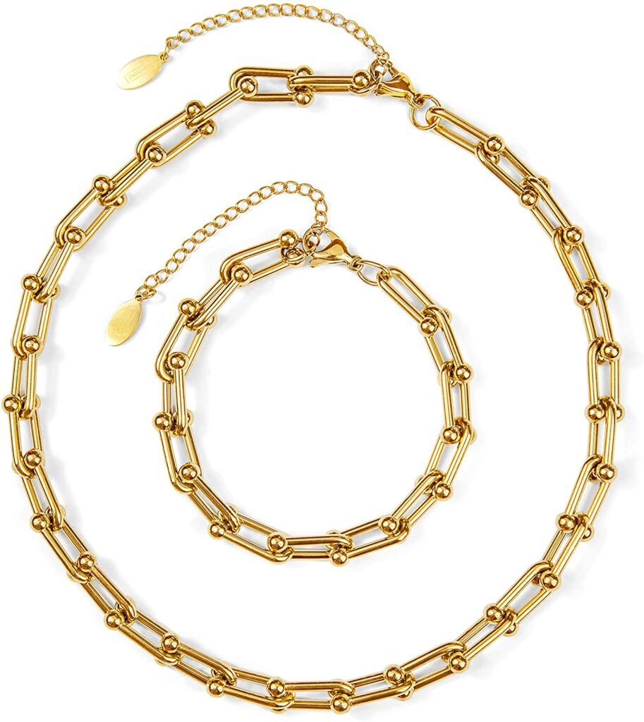 For the effortless icon who’s always planning their next look, this chic fashion-forward paper clip chain necklace and bracelet set is a must-have. The sleek and elegant 14k gold plated chain set will accentuate any outfit this summer.