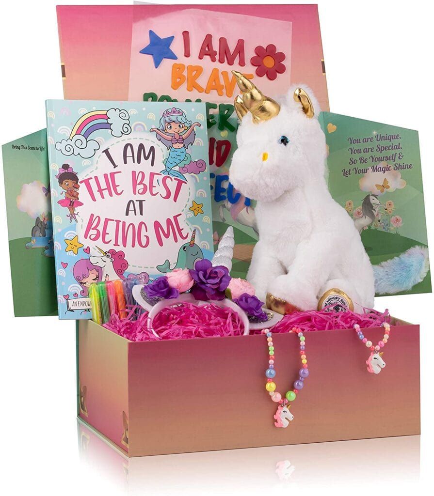 Your kids will love discovering the pure joy of the ultimate unicorn surprise box. This box includes an ever-so-cuddly unicorn stuffed animal, an adorable unicorn headband, a cute unicorn necklace, and a mermaid and unicorn coloring book with markers.