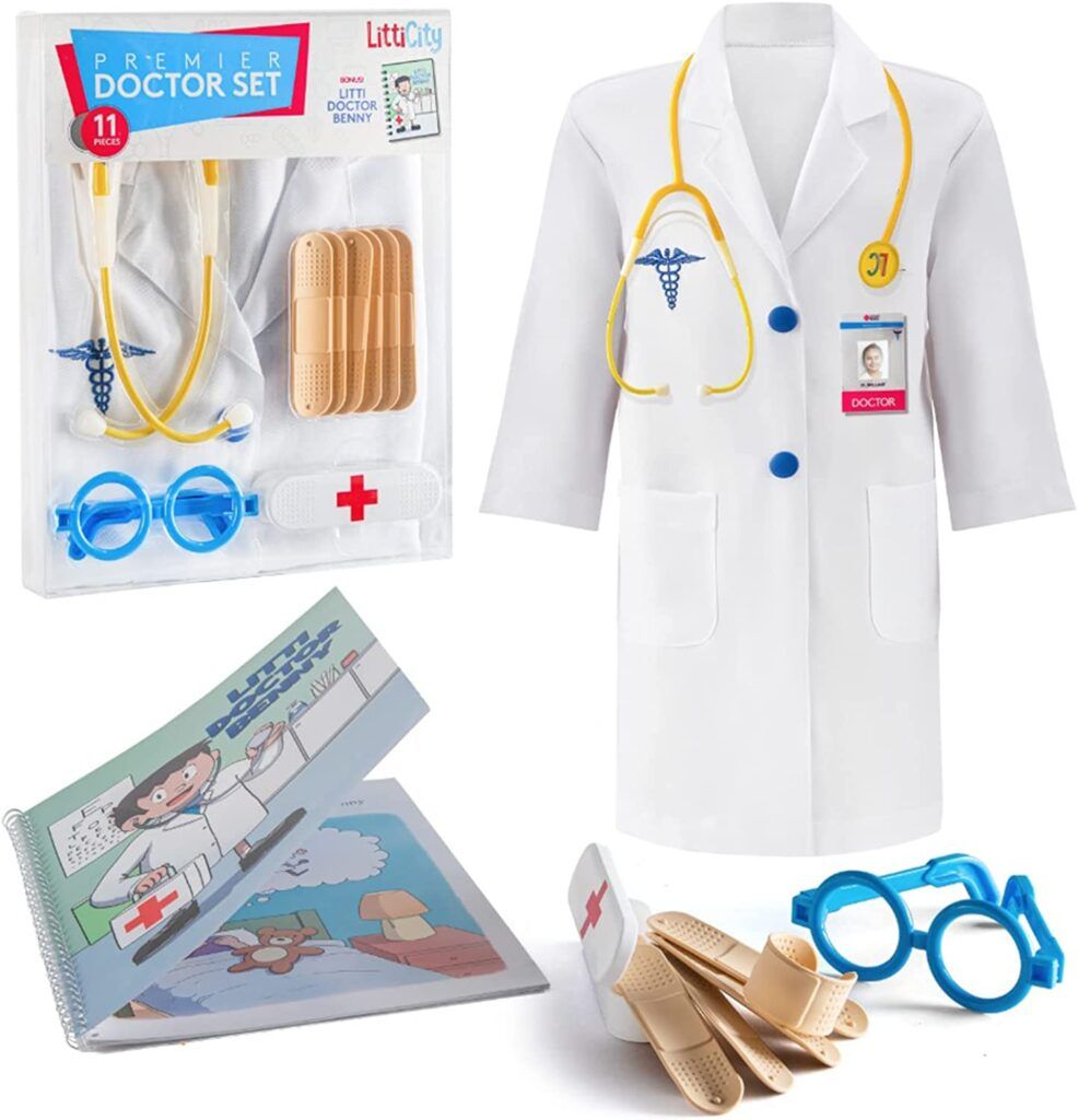 Treat patients with a doctor dress-up set. The kit comes with a doctor’s coat, stethoscope, eyeglasses, six boo-boo bandages, a bandage box, an ID badge, and a story book. All of these items help create a realistic-looking doctor’s office that encourages children’s role play.