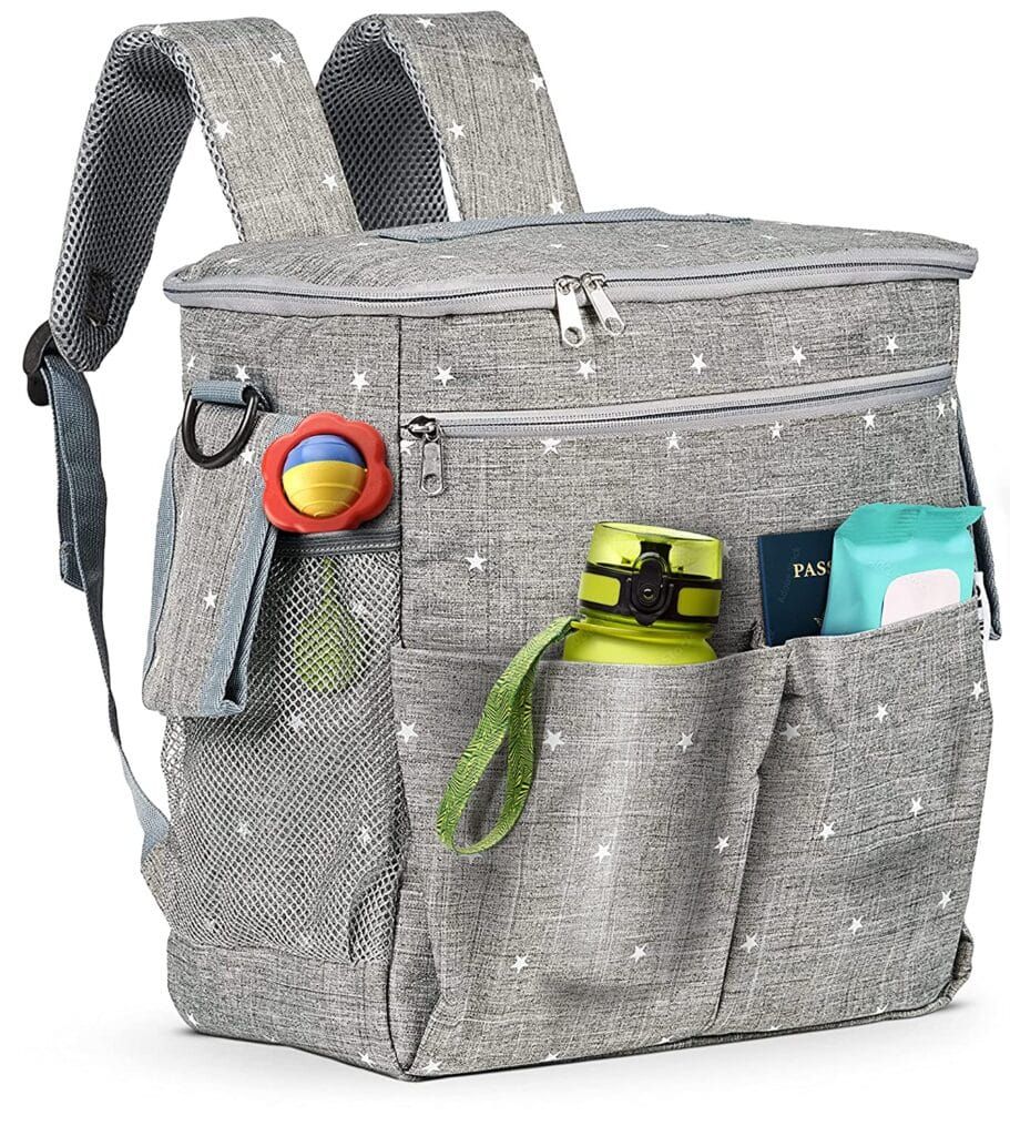 The Ozziko stroller organizer diaper bag is fantastic for busy parents. It has a big enough capacity to hold what you need but it’s lightweight enough to take with you all summer long. Stay organized with side mesh storage pockets and cup holders.