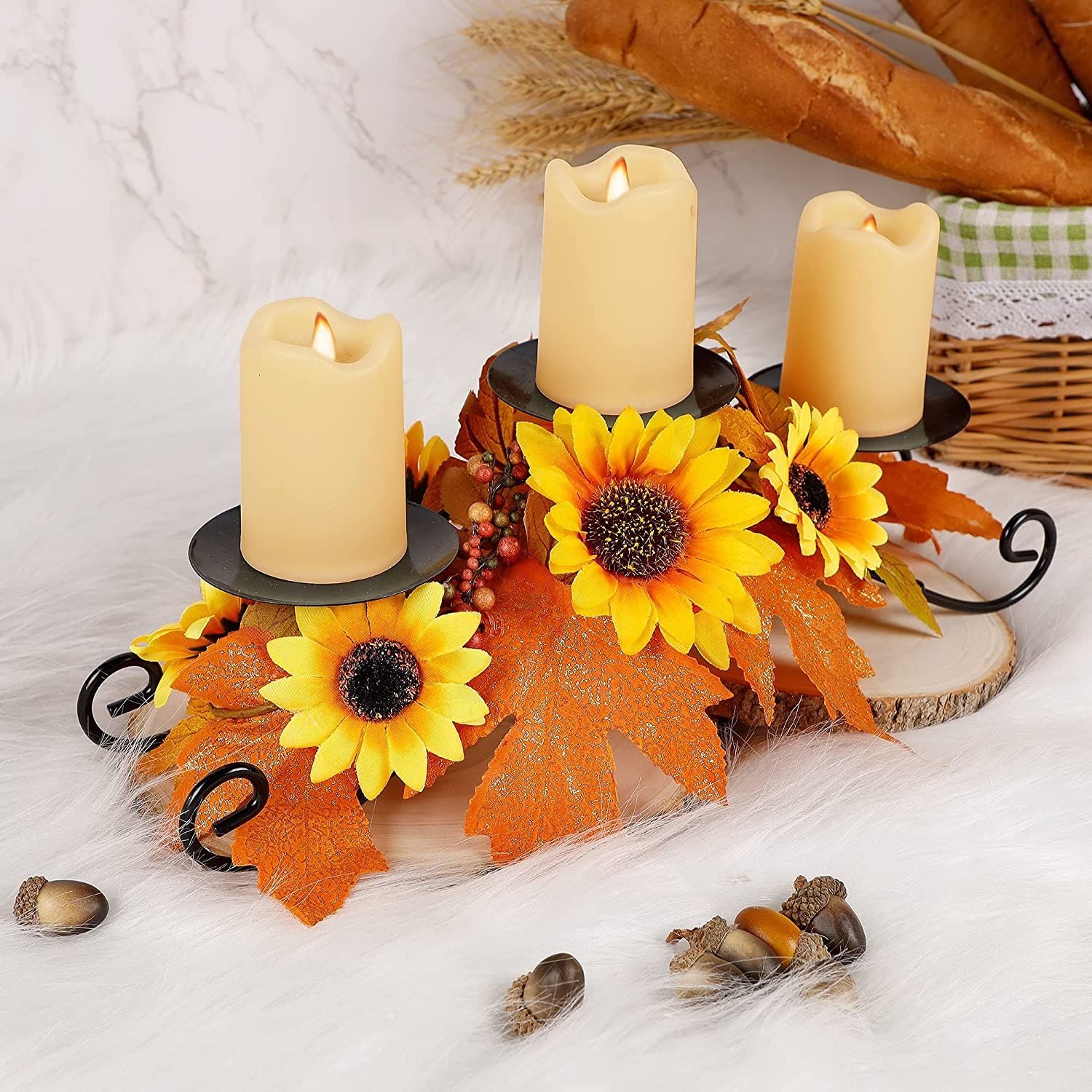 With sunflowers, realistic maple leaves, and clusters of foam berries, this sunflower centerpiece is sure to brighten up your table. This piece has 3 metal candle holders for holding votive candles that will give an ambient glow. Or if you wish to make it child-friendly, you can add artificial candles instead of real ones!