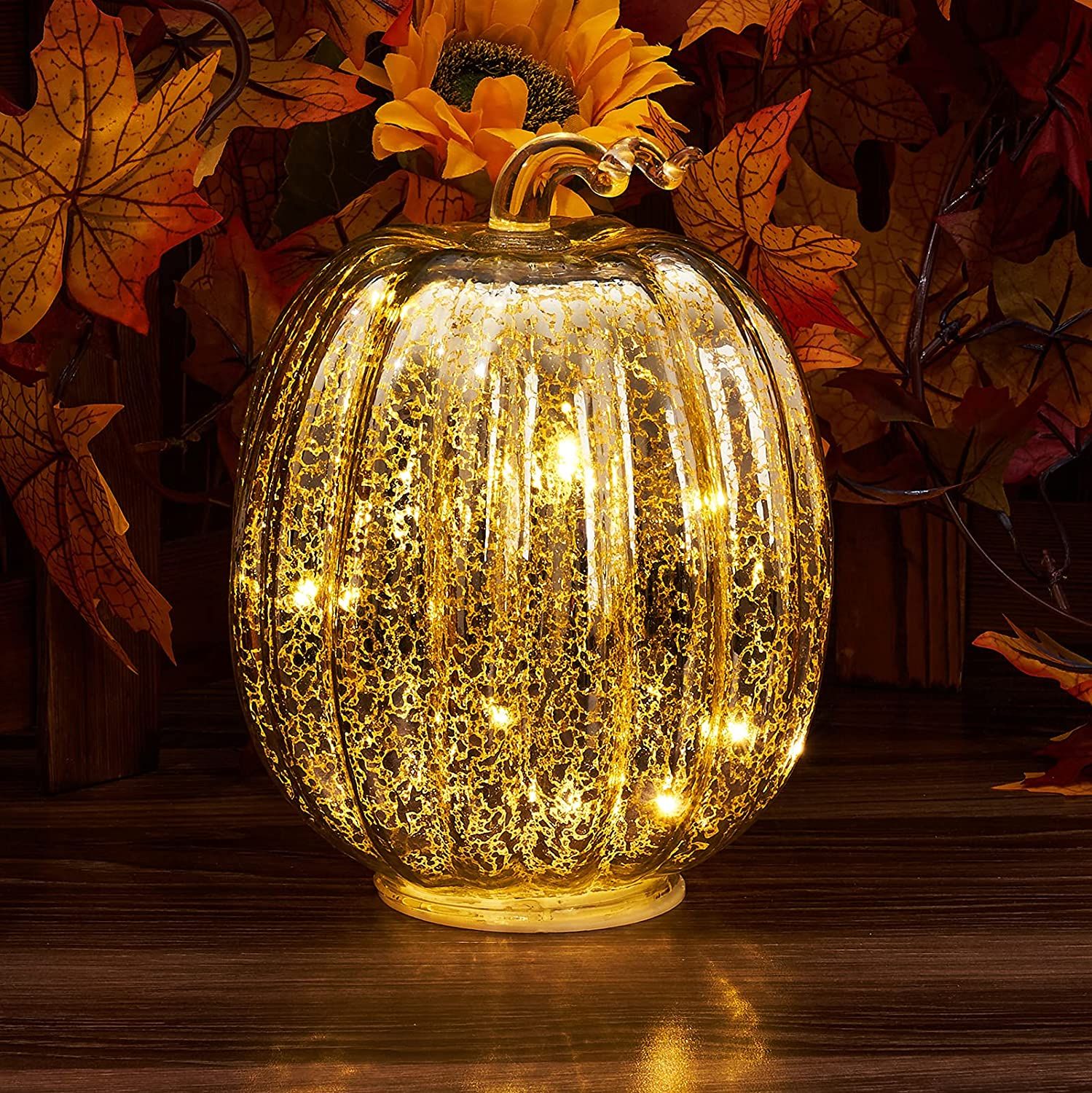 With string lights inside, this mercury glass pumpkin with a shiny accent makes an elegant yet bold centerpiece.