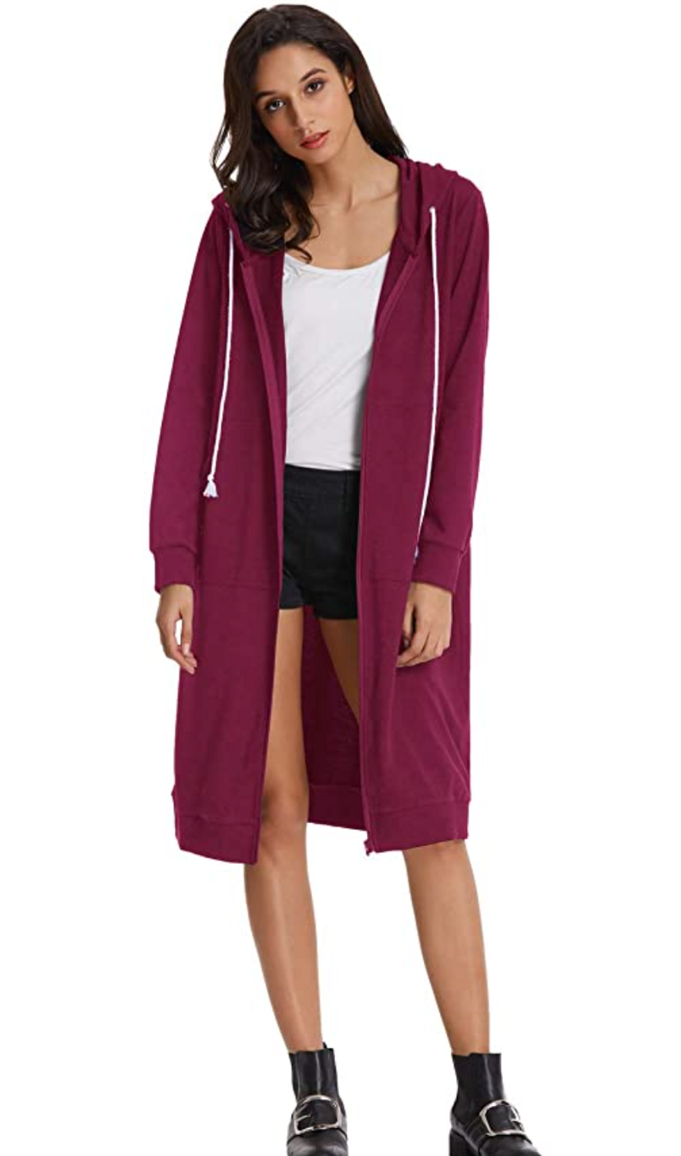 Whether you’re headed to the gym or to hang out with friends, this bomber jacket adds a sporty layer that looks great no matter what casual outfit you’re wearing. It comes in great neutrals but also some really pretty colors like teal, coral, and “millennial pink” to add a cool touch to your outfit. It comes in sizes from small to 2XL and gets great reviews – happy customers report it can fit a sweater underneath but is in no way oversized.