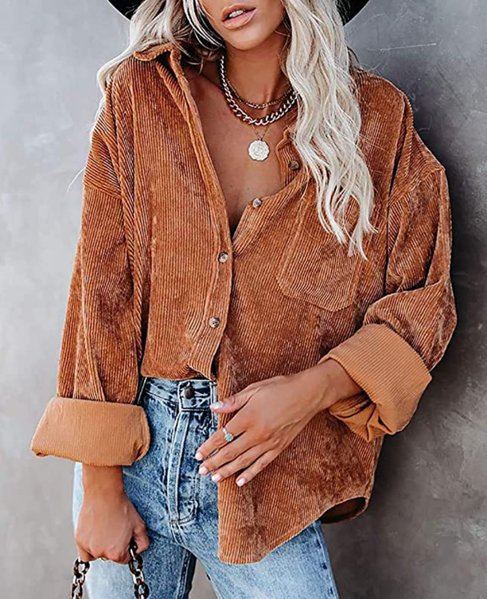 Oversized yet sexy, this lightweight corduroy shirt checks off lots of boxes – cool, stylish, and comfy to name a few! I like wearing mine unbuttoned over a tank top kind of like a light jacket when the temps drop. Wear it with everything from bike shorts to jeans, or even as a bathing suit coverup.