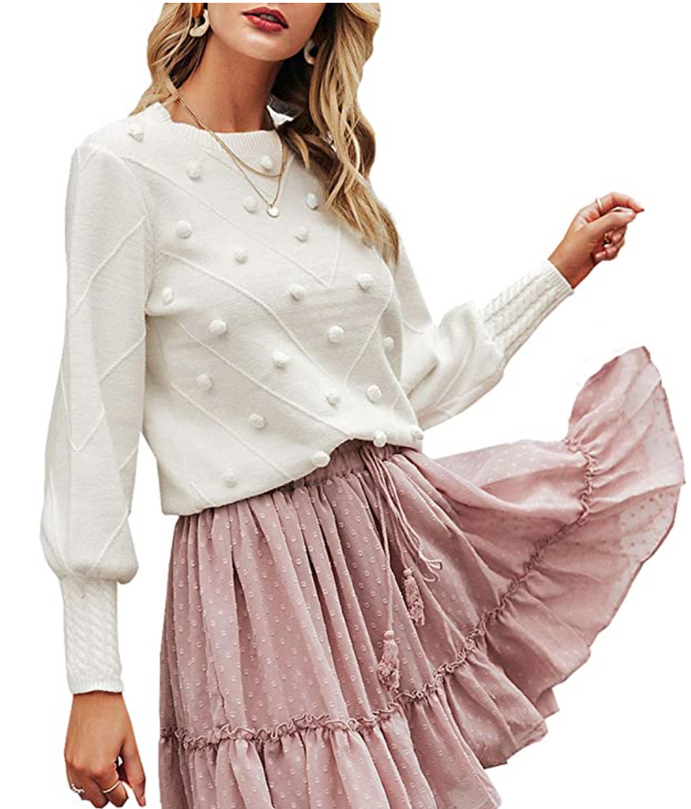 This prettily detailed pom pom sweater is a great layer that’ll bring you through multiple seasons with style. Pair it with floaty skirts in summer, jeans or cords in fall and winter, and capris in the spring. It comes in nine colors but I’m partial to the white since it’ll go with what’s already in your closet!