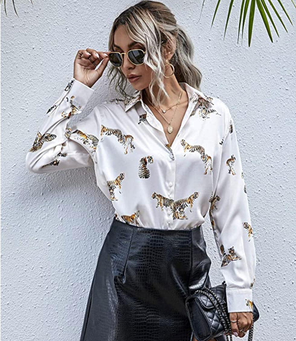 I’m in love with the patterns on this sleek satin shirt that you can wear for work or play. Ranging from stripes and subtle animal print to full on tigers, this reminds me of something you’d grab at a boutique for much more moolah. It’s a bit cropped, but long enough to leave as-is or tied, it makes the perfect companion to high-waisted pants.