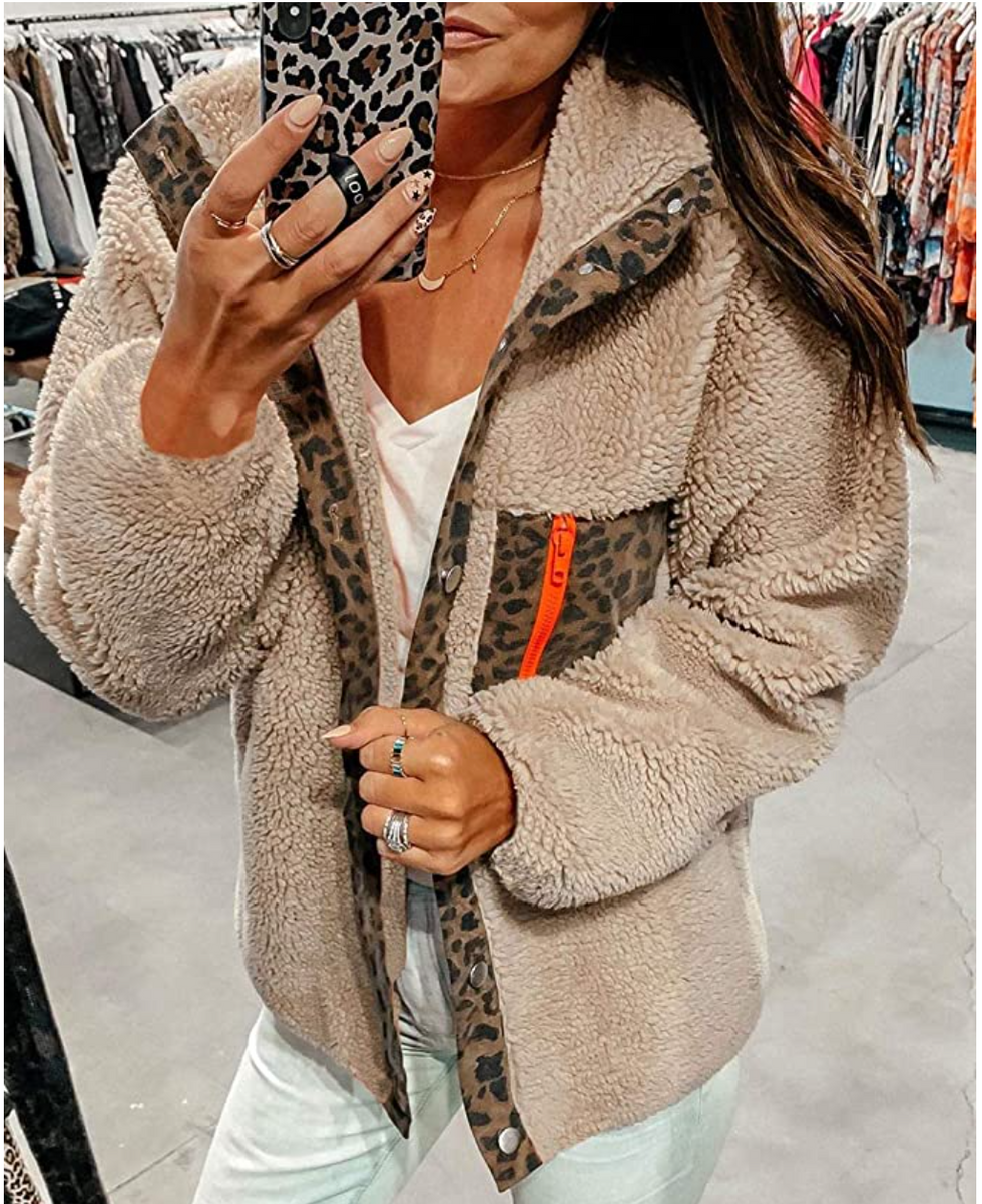 This fuzzy fleece jacket comes in the coolest patterns, like this leopard print detailed one and also buffalo check plaids that are perfect when the temps drop. I love the contrasting pocket and trim, it adds such a special touch. And these jackets are button front, making them pretty unique in a world of zip-up fleeces!