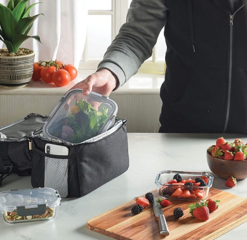This incredible lunch box set makes it so easy to skip the fast food lines and actually eat the lunch you made from home. Take this lunch bag to your office with the 6-piece glass container set. The included ice pack keeps your food fresh and delicious too.