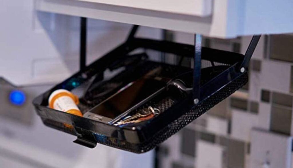How cool is this storage accessory? You just attach it easily with screws under and desk or cabinet and it can keep all your clutter like your pens, papers, gadgets, and post-it notes off your desk but still within reach. The black metal mesh design is so simple and sophisticated in its look that it matches any decor too.