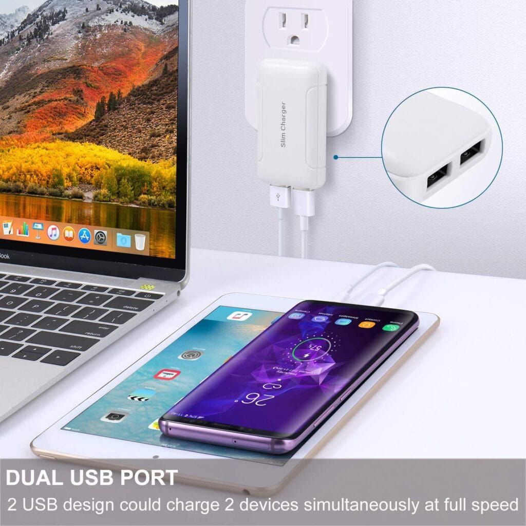 This wall charger has a much slimmer design compared to regular bulky chargers, which means it can fit behind virtually any piece of furniture. More importantly, it doesn’t bend your charger cord, so it lasts longer. And you can charge two devices at once with its two slots.