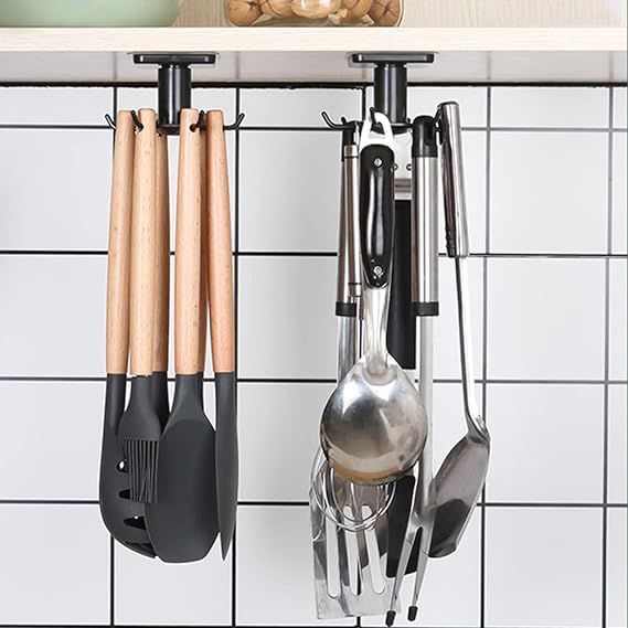 These hooks are such a unique way to store things. I have them in so many different places in my home. Like the picture, I too use them for storing my kitchen utensils. But I also put them in my closet for storing my jewelry and even in my bathroom for all my loofahs. The best part: they rotate!