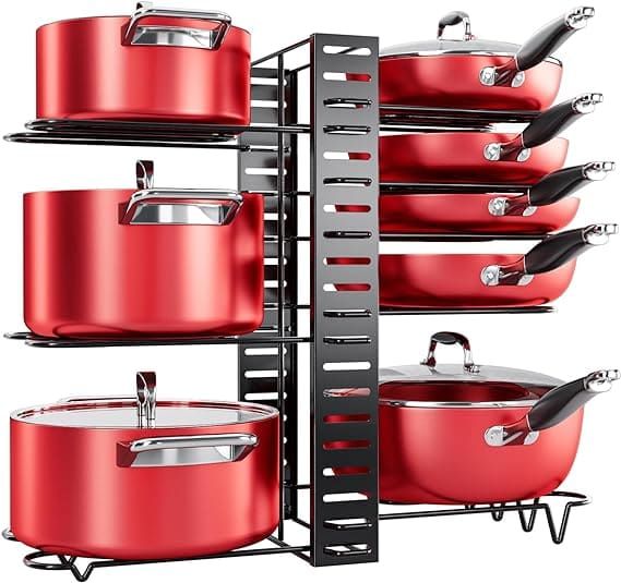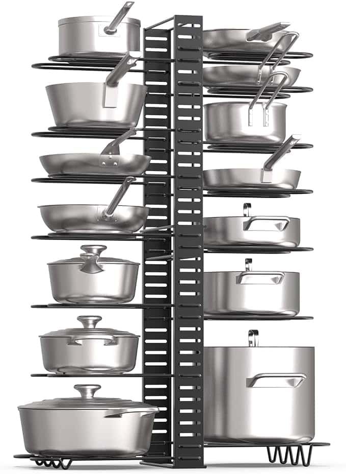 Oh, the dreaded cabinet with the pots and pans just shoved in there. Ever need a specific one and, gulp, it’s on the bottom? What a nightmare! Put an end to the madness with this Mudeela pots and pans organizer, specifically designed to give your cookware a place to call home.