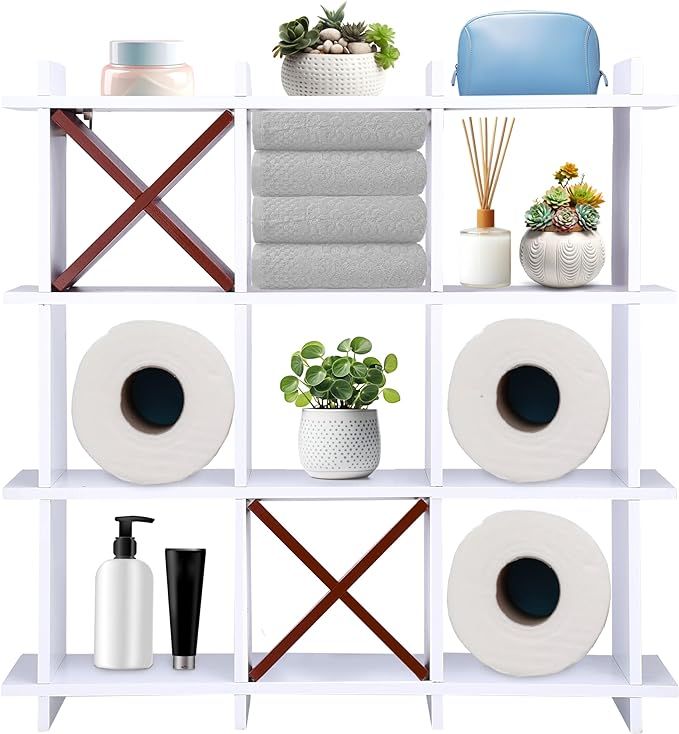 Introducing the Tic Tac Toe Toilet bathroom organizer: a unique addition to your bathroom decor. This innovative storage solution offers a rustic wall-mounted bathroom shelf, doubling as a practical and decorative piece. Crafted from sturdy wood with a white and brown cross design, the Tic Tac Toe toilet paper stand provides a fun, space-saving way to store and display your toilet paper rolls.