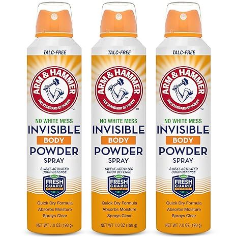 Arm & Hammer Invisible Body Powder Spray is a clear body powder that provides effective odor and sweat control. It comes in a convenient spray bottle that is easy to use and absorbs quickly, leaving no residue or mess.