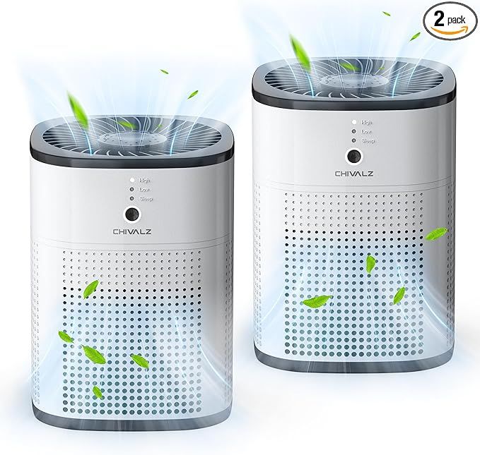 This air purifier 2-pack provides efficient air purification for bedrooms and home environments with a 3-in-1 filtration system, True HEPA filter, and quiet operation.
