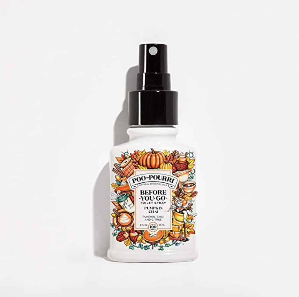 You can purchase a before-you-go Poo-Pourri that has a pumpkin chai scent. Simply spritz the bowl before use and all you will smell is an uplifting blend of pumpkin, cinnamon, and citrus natural essential oils.