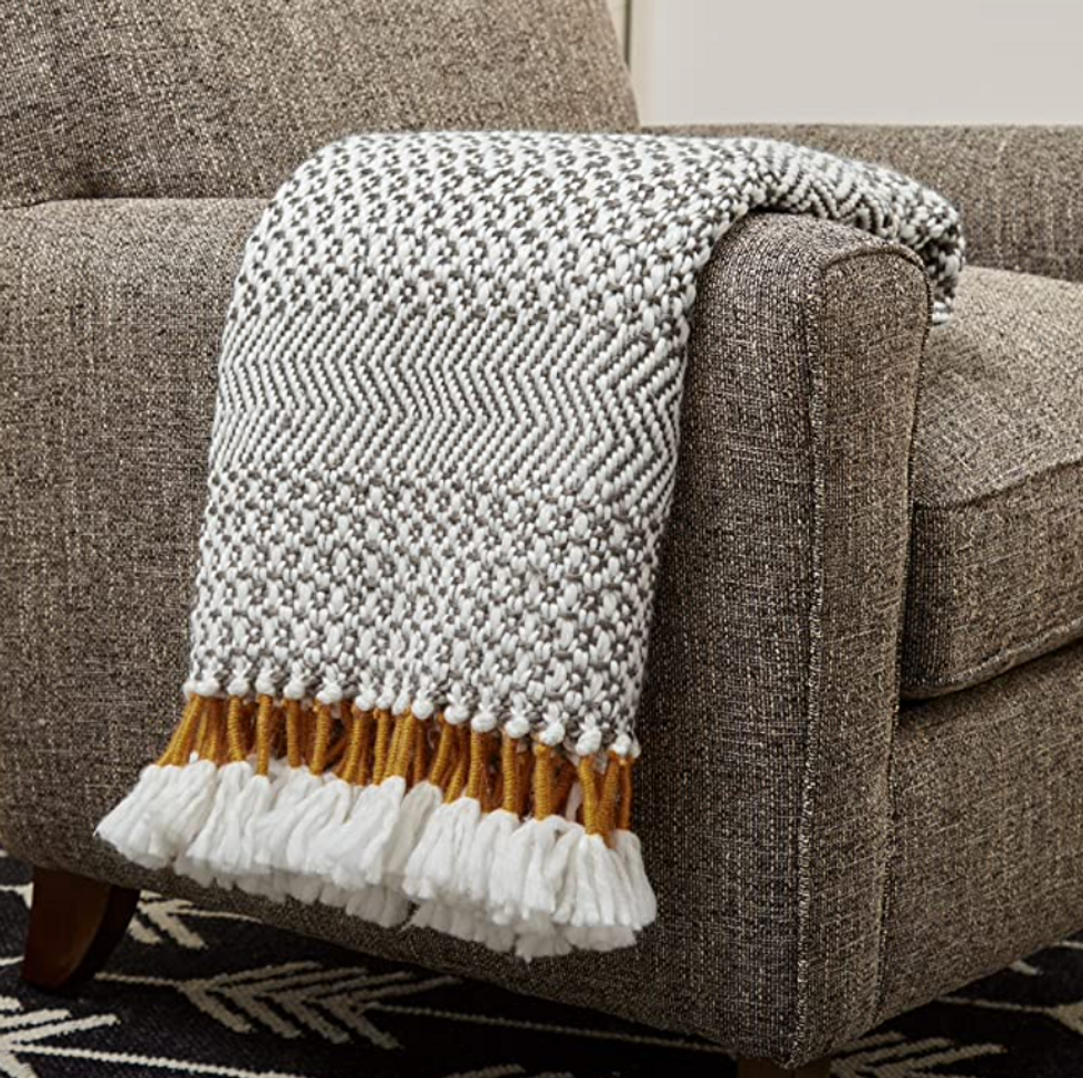 With the cold weather on the way, this soft and stylish blanket is just what you need. With a geometric weave and tassels that give a pop of subtle color, this blanket will match with any room and is perfect for getting cosy on the couch.