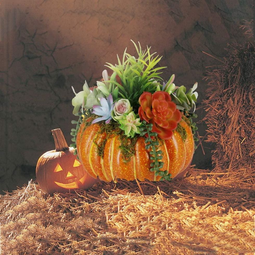 “Beautiful and larger than I expected! Vibrantly colored faux succulents. Bright, cheery pumpkin! Perfect Autumn decor,” one customer wrote.