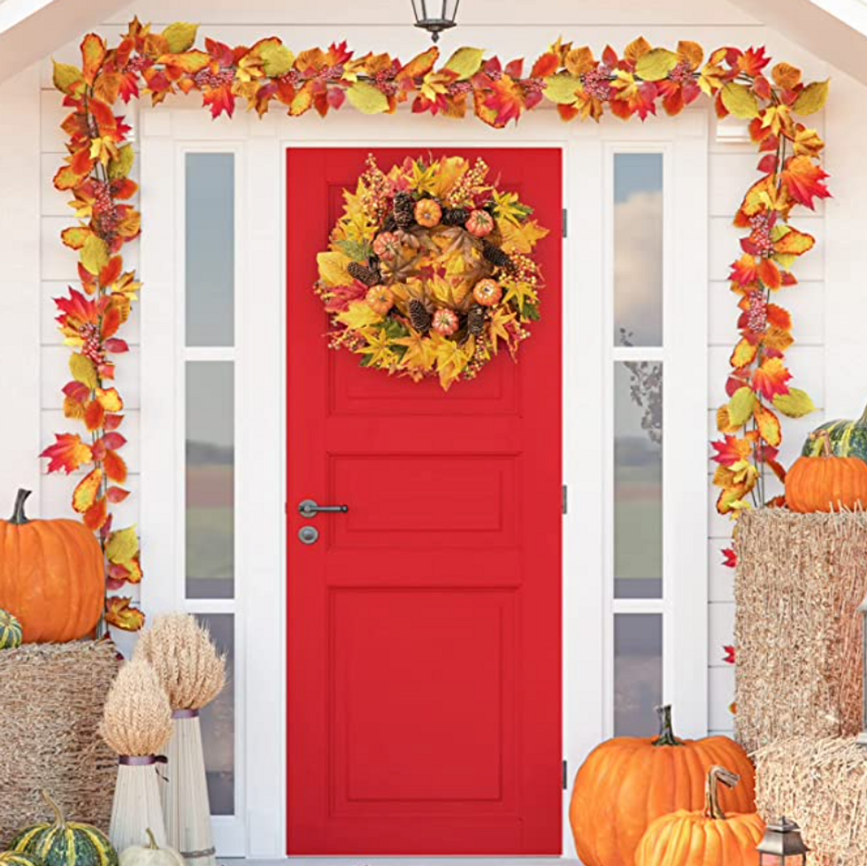Suitable for indoor and outdoor use, this wreath is bright, vibrant and packed with a combination of fall elements. Made with realistic pine cones, pumpkins and faux maple leaves, it looks full and has a life-like appearance. It looks so great you’ll want to keep it up all year round!