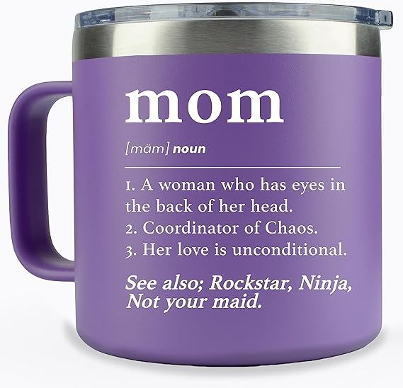 How do we even begin to define “mom”? Well, this coffee tumbler makes a good effort. With a quick hand definition, this coffee cup is not only clever, it’s practical. Mom definitely needs her morning cup, so let her have it with this cup that reminds her you see her.