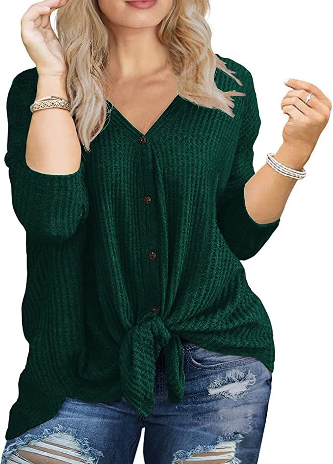 I have first-hand experience with these waffle tops with a tie-front hem and all I can say is, “Just do it.” These are the perfect weight and length and look great with just about anything. The dark green and red are giving Christmas but there are plenty of neutrals you can pair with existing pieces from your closet. Sizes here go up to 4X.
