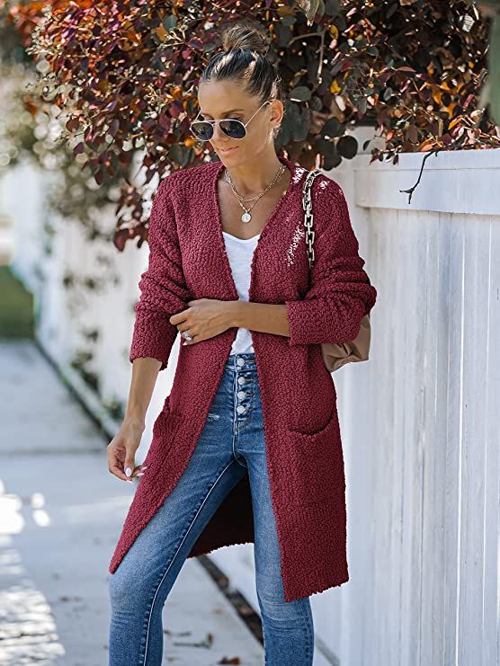 Oh, cardigans, how I love you. You double as a coat but operate like a sweater and when I’m having hot flashes, I can throw you off and rock my T-shirt underneath. This open-front cardigan has a popcorn yarn material, which adds visual interest, and a long length that works well with leggings. There are a ton of colors to choose from here, too.
