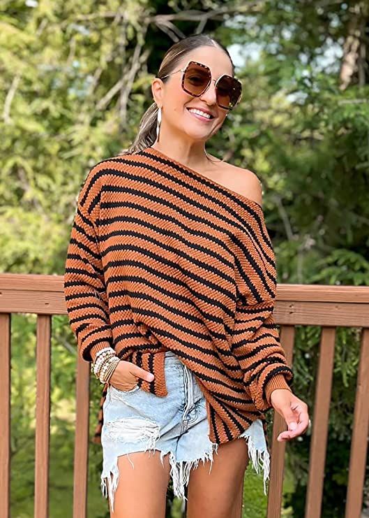 Stripes are always in season and this oversized crewneck sweater will keep you looking cool (while feeling warm) until the weather starts to warm. This slouchy sweater has side slits, a tunic-length (if you want) and an easy pullover styling. Dress it up for work with slacks or throw it on with jeans for a casual weekend look. But, definitely try the brown option pictured.