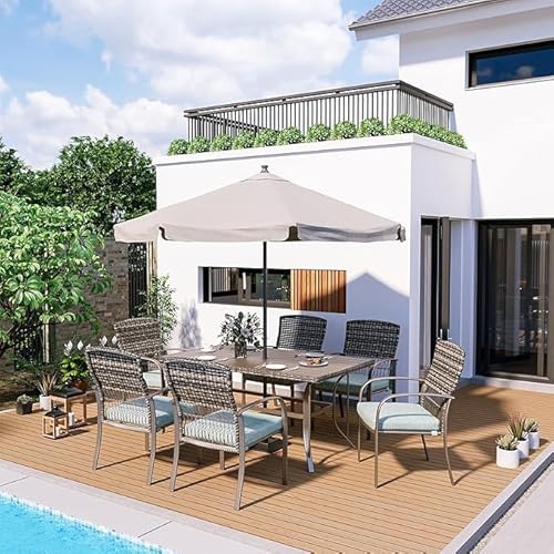 Get ready to elevate your outdoor space with this chic 7-piece patio dining set! Featuring a durable wicker design and a sleek iron slats table top, it’s perfect for backyard barbecues or poolside parties. Plus, those comfy removable cushions in green will make your guests linger longer!