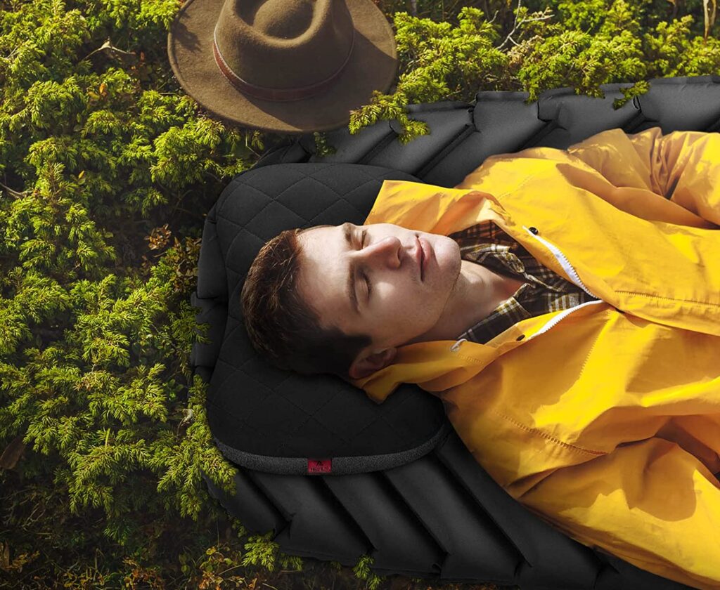 The reviews say: “Really tiny in the package, and super lightweight. I love the texture of the pillow, it isn’t sticky and plasticky like most portable pillows. It also doesn’t deflate overnight at all. Really great support and nice colour options. The strap is also a genius feature that keeps your pillow from sliding around your sleeping pad.”